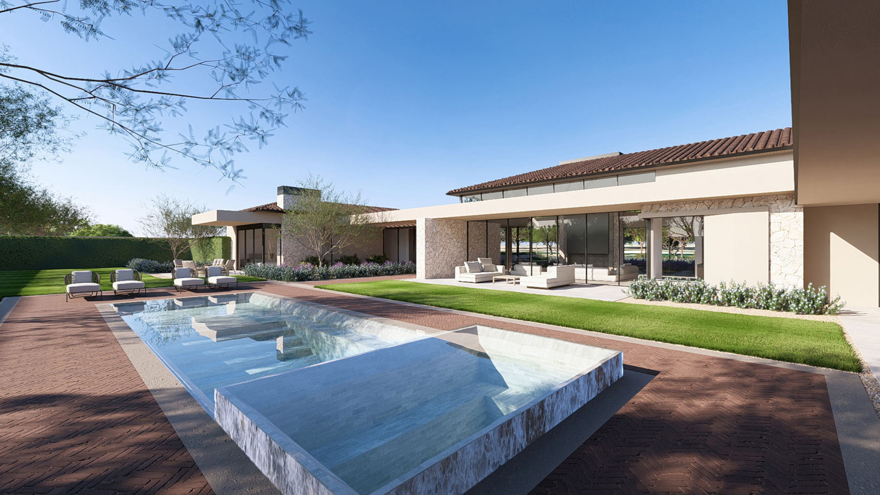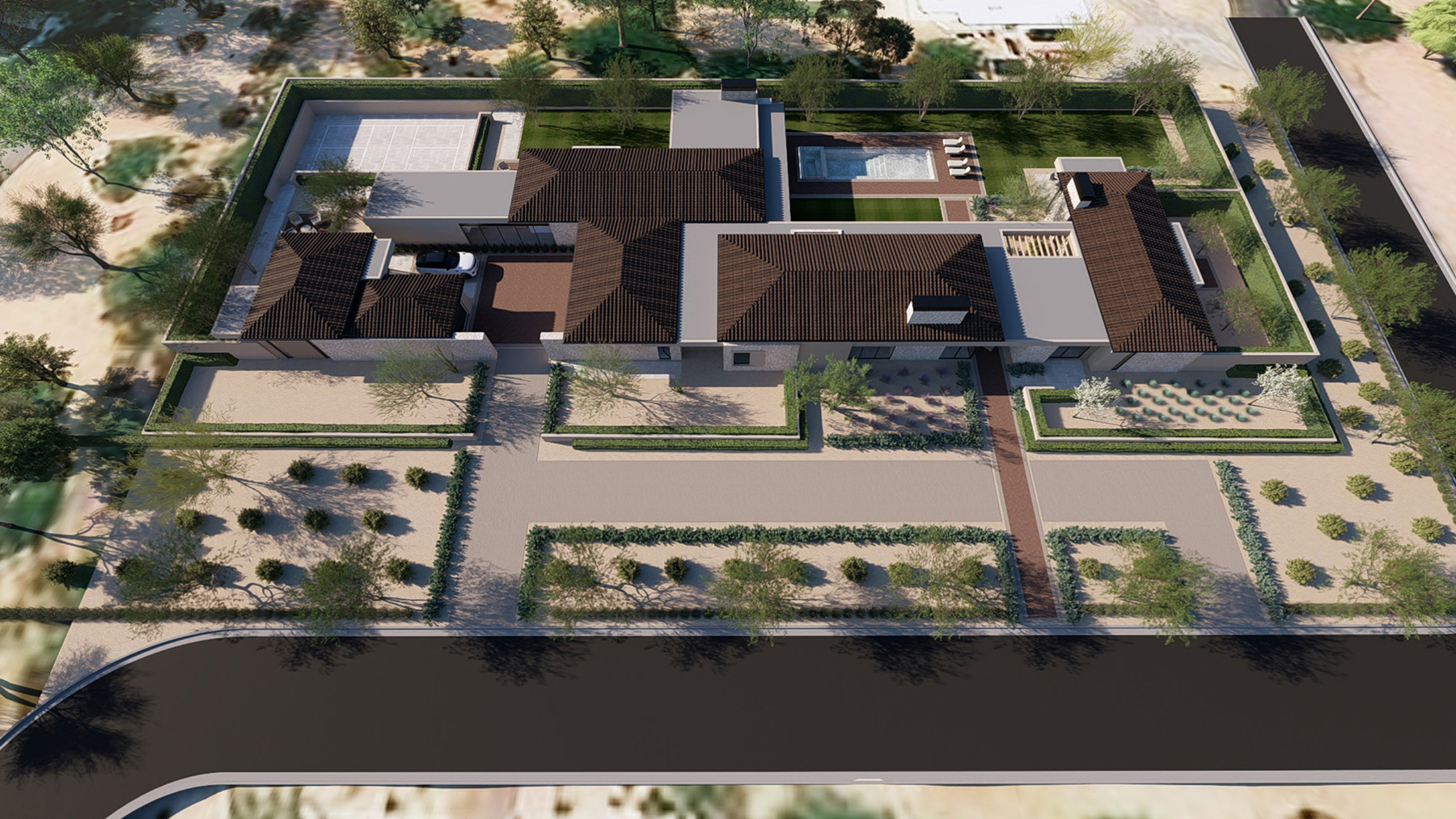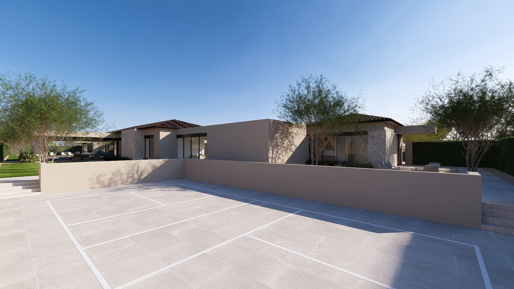 This refined contemporary residence is designed for elevated living and effortless entertaining, featuring an open-concept main living area with strong indoor-outdoor flow. The gourmet kitchen is anchored by professional-grade appliances, an oversized waterfall-edge island, a full Butler’s Kitchen, walk-in pantry, and temperature-controlled wine room, creating an ideal setting for hosting and everyday luxury. The expansive owner’s suite offers a spa-inspired bath, dual walk-in closets, and a private terrace or courtyard retreat. Dedicated spaces including a private home office, media room, and game room or lounge with wet bar enhance the home’s livability, while smart-home technology, motorized shades, and energy-efficient systems ensure modern comfort. Outdoor living is brought to life through a resort-style backyard complete with a pool and spa, outdoor kitchen, fireplace, shower, sport court, fire pits, and professionally designed landscaping. A livable casita and a three-car garage with EV charging complete this thoughtfully designed home, offering a seamless blend of luxury, functionality, and lifestyle-driven design.